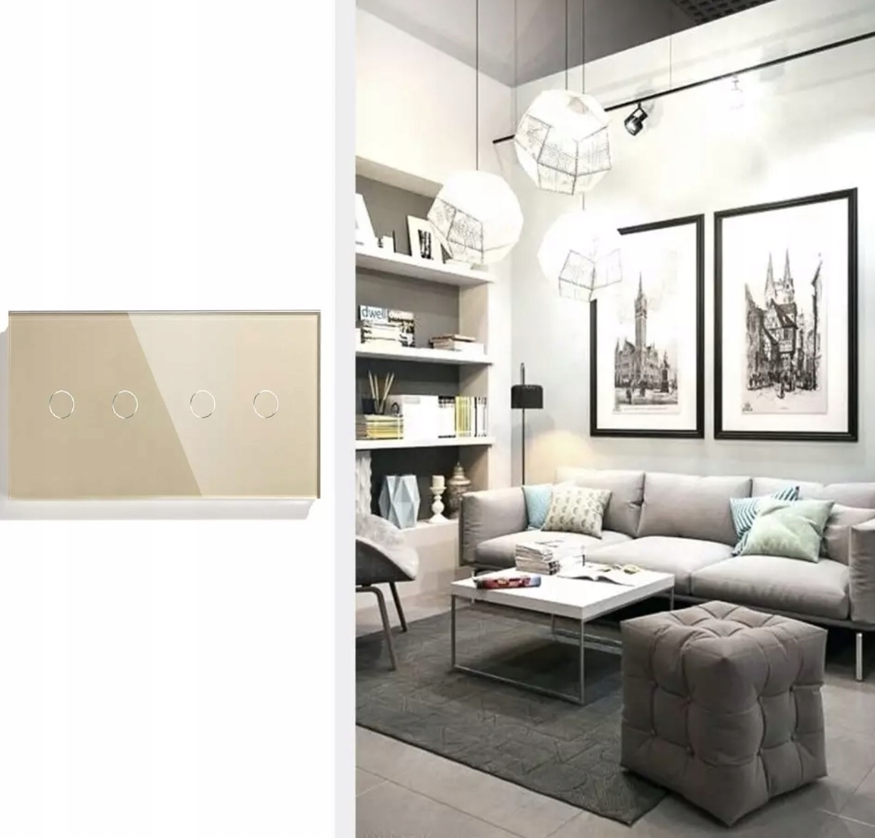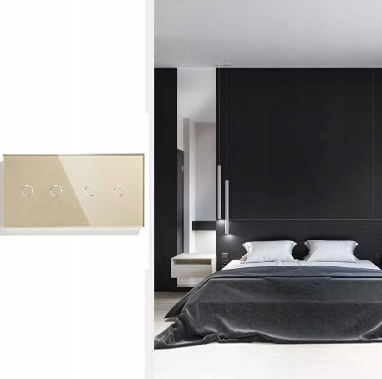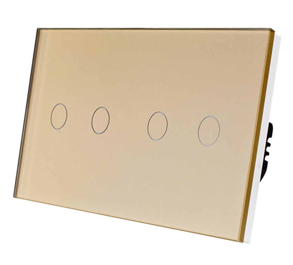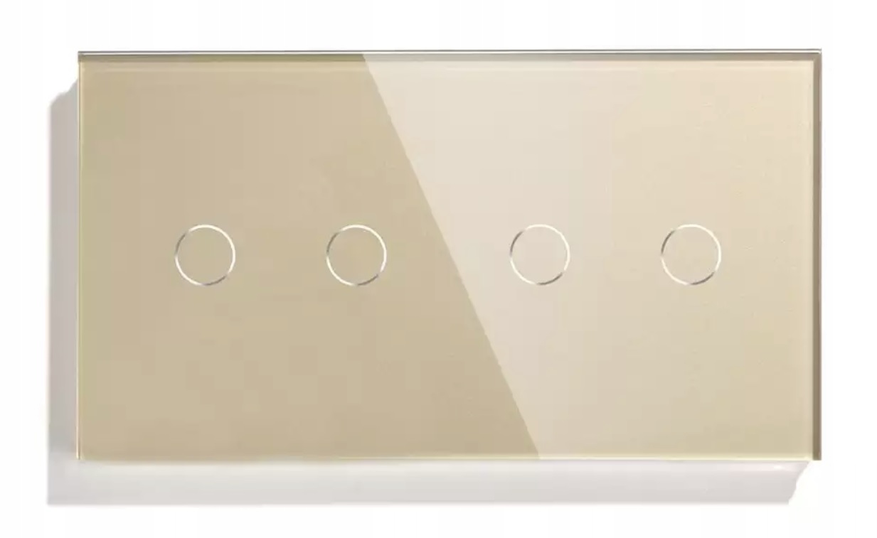 Aukcja dotyczy włącznika poczwórnego, do podwójnej puszki elektrycznej, w kolorze złotym, z panelem ze szkła hartowanego 157mm