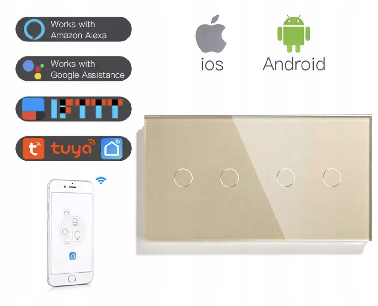 Dotykowy włącznik światła poczwórny, z funkcją zdalnego sterowania za pomocą sieci WiFi i aplikacji TUYA lub SMART LIFE.