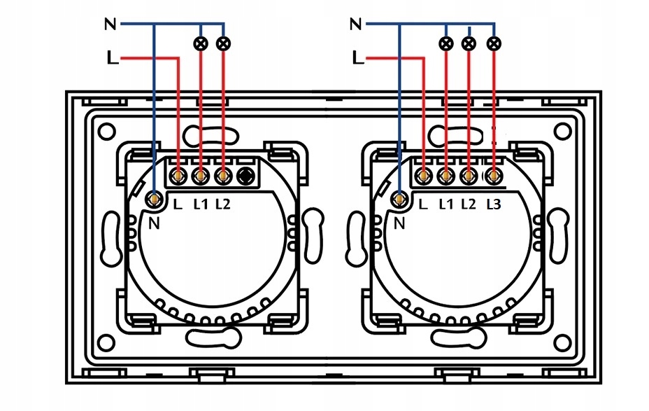 Do prawidłowego oraz bezpiecznego działania włącznika, należy podłączyć go za pomocą przewodu L (zasilanie 230V) oraz N (wejście neutralne). W pierwszym module włącznika podłączamy L – zasilanie oraz L1 i L2 wyjście i w drugim module analogicznie, L – zasilanie oraz L1 i L2 wyjście.
