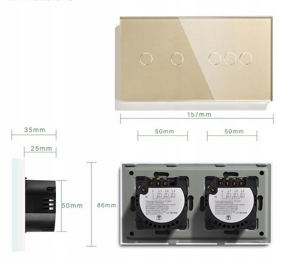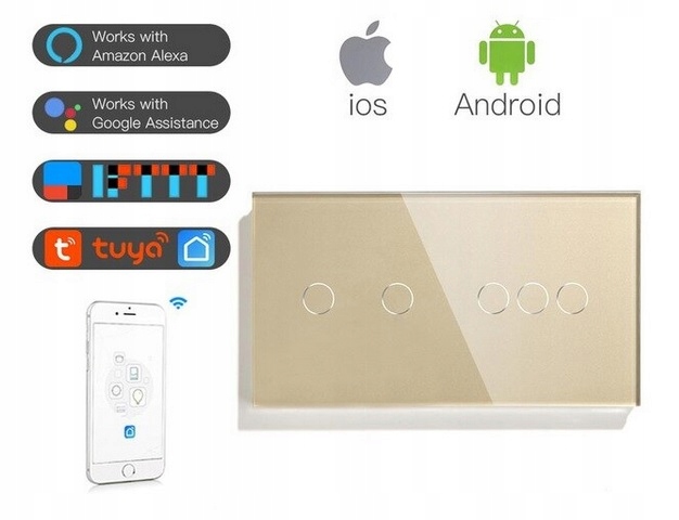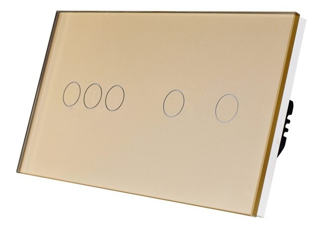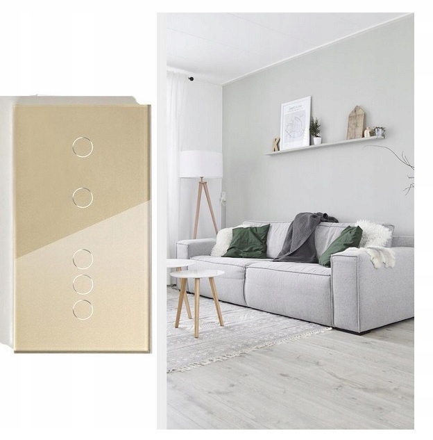 Aukcja dotyczy włącznika z pięcioma przyciskami – 5 kanałów , do podwójnej puszki elektrycznej, w kolorze złotym, z panelem ze szkła hartowanego 157mm