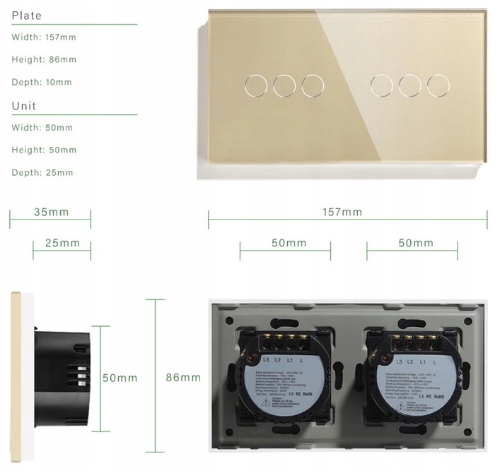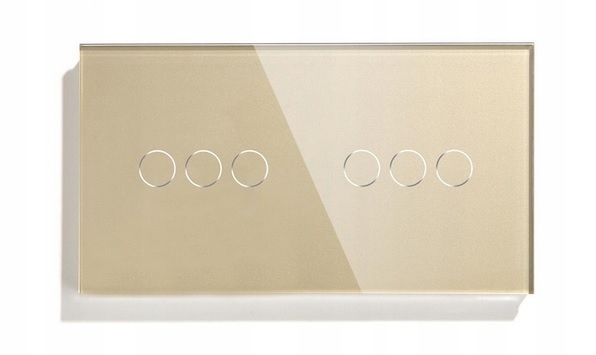 Aukcja dotyczy włącznika z sześcioma przyciskami – 6 kanałów, do podwójnej puszki elektrycznej, w kolorze złotym, z panelem ze szkła hartowanego 157mm