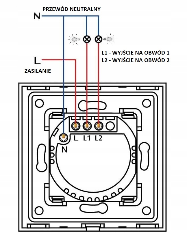 Do prawidłowego oraz bezpiecznego działania włącznika, należy podłączyć go za pomocą przewodu L (zasilanie 230V) oraz N (wejście neutralne). Natomiast wyjście na kanały (odbiorniki, światło, np. lampy itp.) należy wpiąć odpowiednio przy włączniku pojedynczym L1, a w przypadku podłączenia włącznika podwójnego L1 oraz L2.