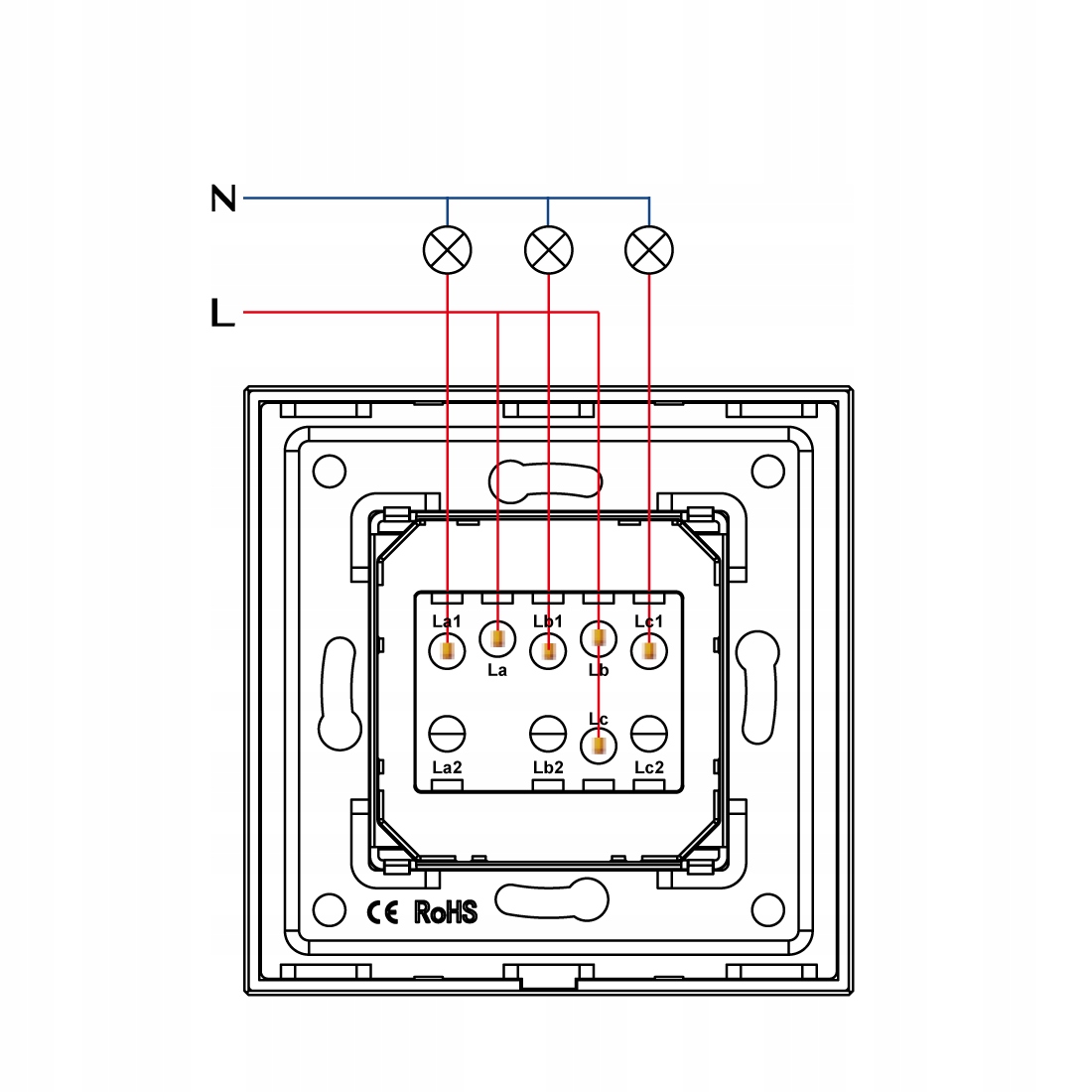 Do zacisku La i Lc podłączamy przewód fazowy oraz do zacisku La1, Lb1 i Lc1 przewody wyjściowe do obwodów odbiorników (lampa, oprawa oświetleniowa).