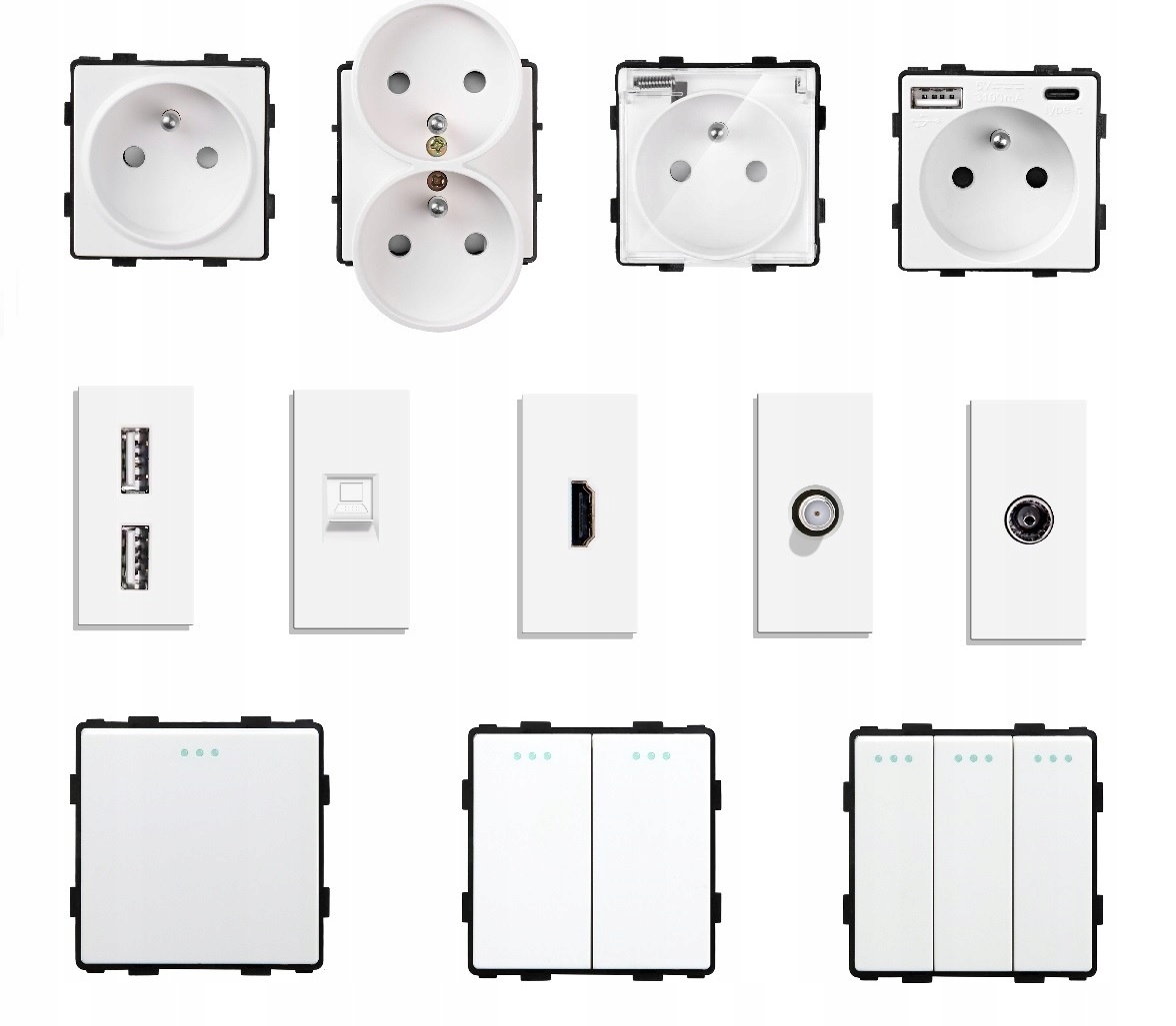 W naszej ofercie dostępne są różne konfiguracje włączników światła oraz gniazd elektrycznych, pozwalające na idealne dopasowanie do indywidualnych potrzeb instalacyjnych.
