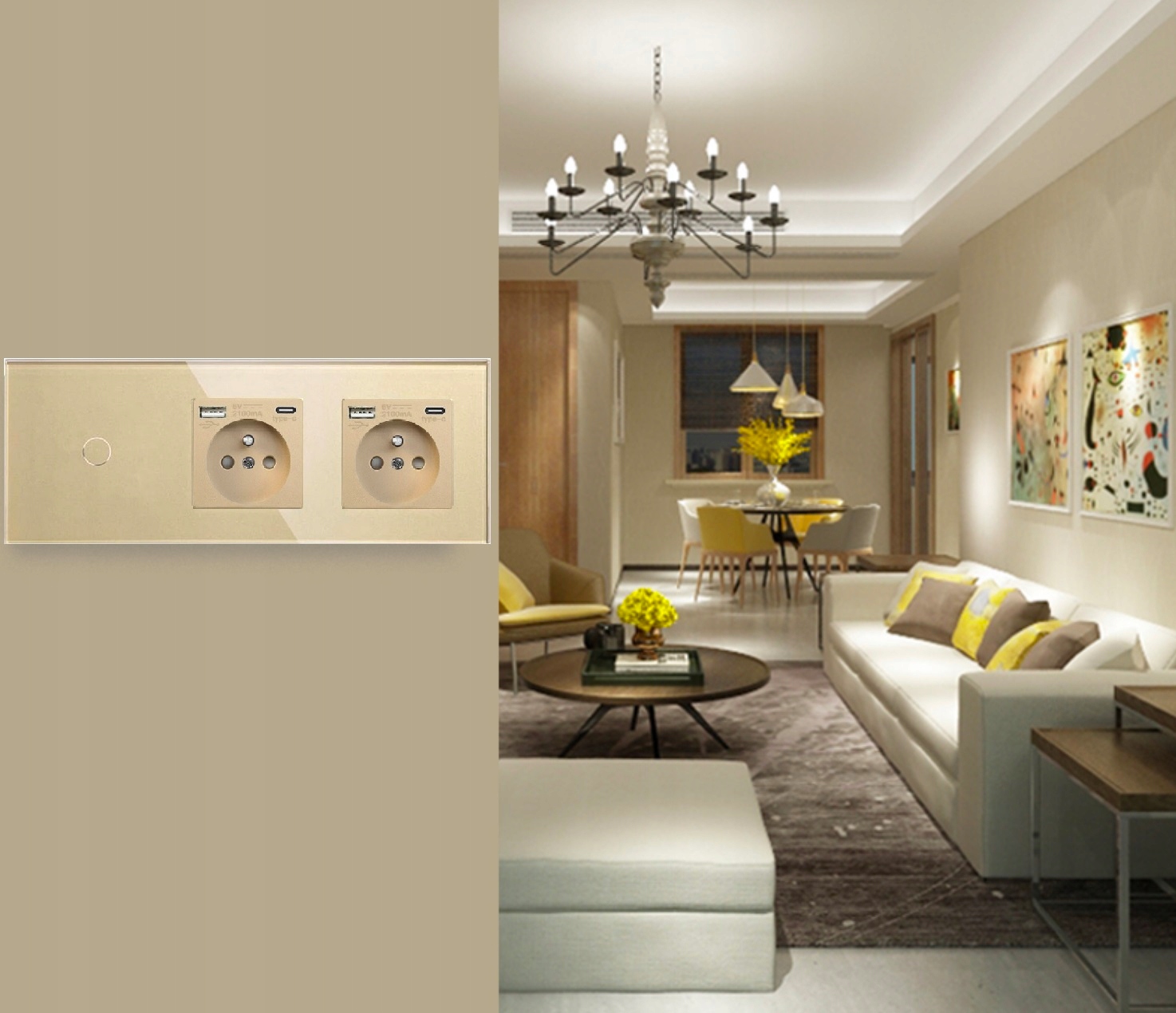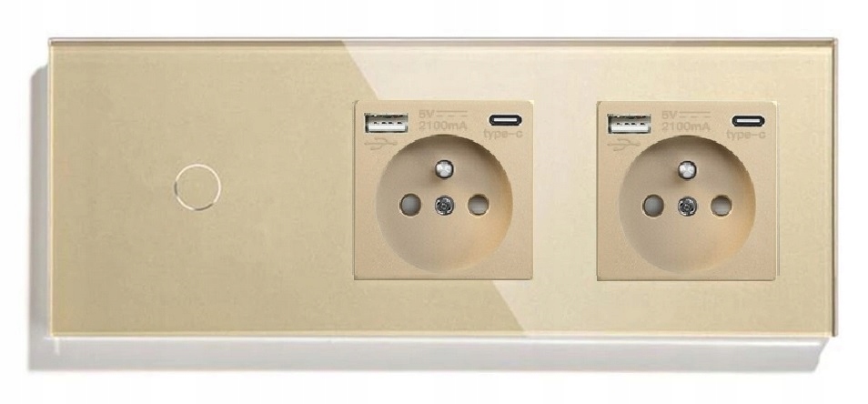 Dotykowy włącznik światła pojedynczy z dwoma gniazdkami elektrycznym oraz dwoma portami USB w kolorze złotym. Panel wykonany ze szkła hartowanego o szerokości 228mm
