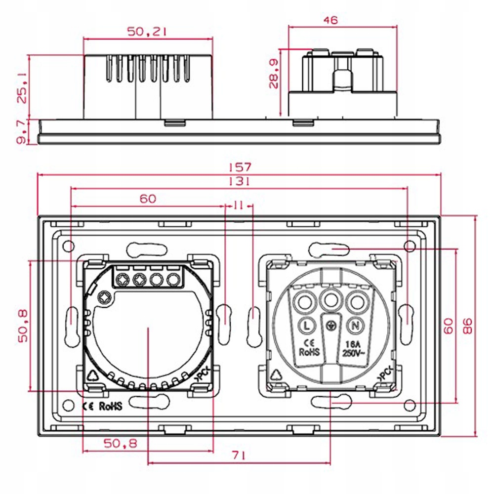 - Montaż za pomocą śrub do standardowej podwójnej puszki elektrycznej 60mm