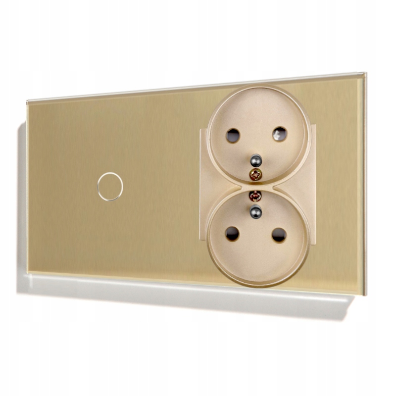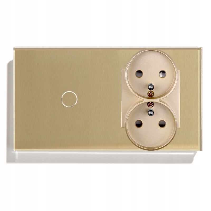 Dotykowy włącznik światła pojedynczy z podwójnym gniazdkiem elektrycznym w kolorze złotym. Panel wykonany ze szkła hartowanego o szerokości 157mm